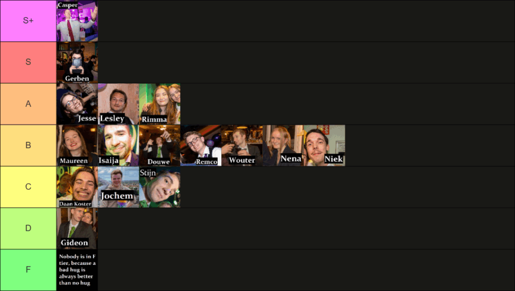 I (Julia) have had the idea for a while now to make a hug tier list of people within Watt. I have devised this list based on a set of criteria that I’ve tried to make as objective as possible.